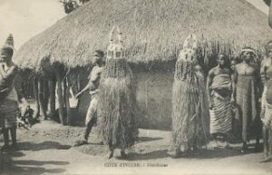 Plusieurs clichés mentionnent le fétichisme : le fétichisme désigne, au sens propre, l’adoration des fétiches. Le terme provient étymologiquement de feitiço (« artificiel » puis « sortilège » par extension), nom donné par les Portugais aux objets du culte des populations d’Afrique durant leur colonisation de ce continent. Outre la petite case fétiche (vue sur le cliché du village plus haut), on peut voir « le rocher fétiche » ou des fétichistes en costume (avec des masques de perles et entièrement recouvert de costumes de fillasse végétale).
