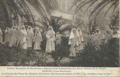 Une photo-carte postale montre un groupe de religieuses. Elle porte cette légende : « Petites Servantes du Sacré-Cœur, Missionnaires Catéchistes des Noirs (Maison de la Vierge), Menton (Alpes-Maritimes), Auxiliaires des Pères des Missions Africaines, 150 cours Gambetta, Lyon.